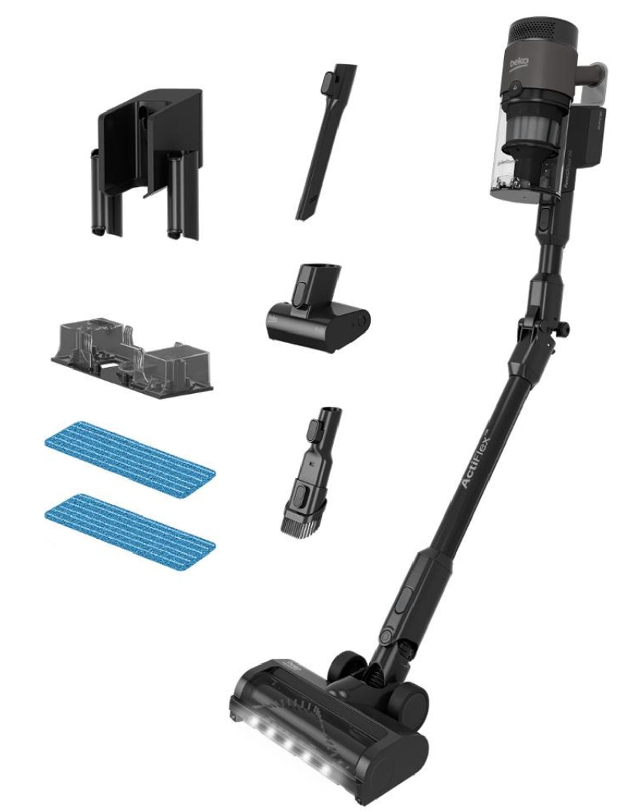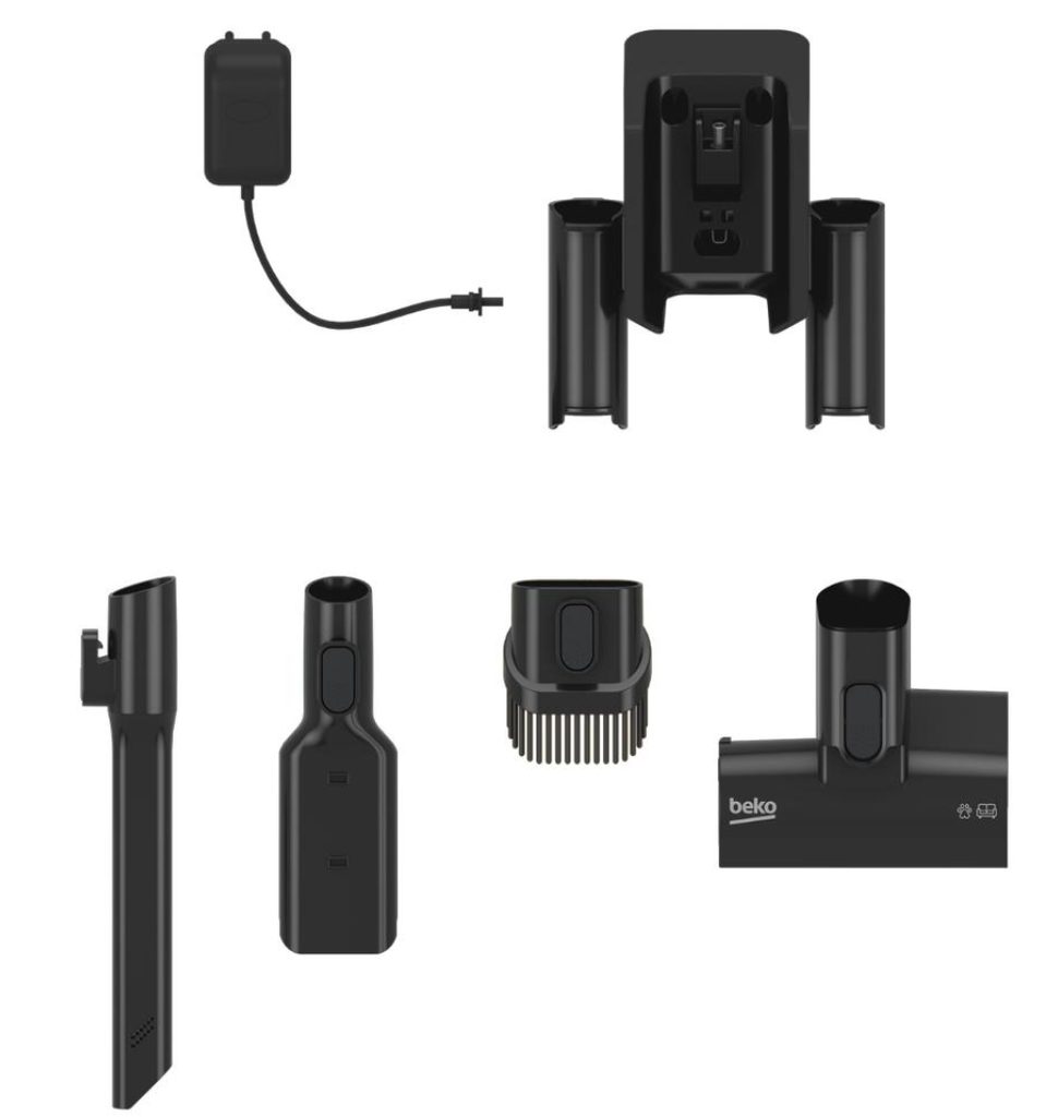 - Nástěnný držák: Umožňuje praktické uložení vysavače a příslušenství.