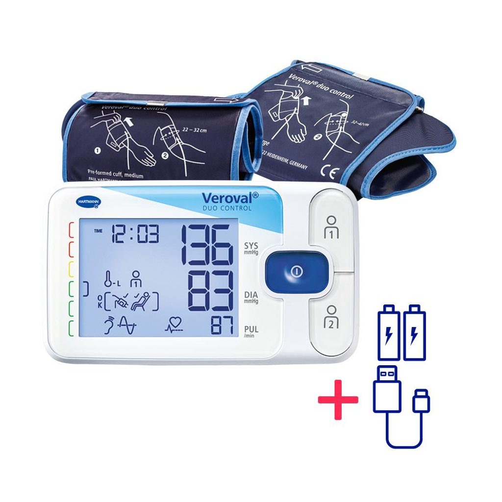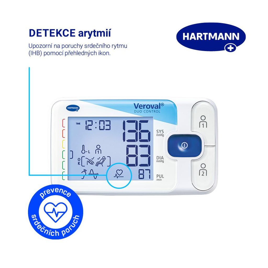 Tlakoměr Veroval® duo control je prémiový tlakoměr pro ty z vás, kteří chtějí mít jistotu přesných výsledků a zejména pro osoby se srdeční arytmií nebo její predispozicí. Tento model velmi přesně měří krevní tlak i v případě nepravidelného srdečního rytmu, což běžně dostupné digitální tlakoměry nemohou zaručit. Pyšní se totiž patentovanou kombinací 2 metod měření Duo Sensor: oscilometrické metody, kterou využívá většina domácích tlakoměrů, a poslechové metody, se kterou se setkáte u lékaře při vyšetření pomocí rtuťového tlakoměru a fonendoskopu. Dopřejte si to nejlepší z nabídky tlakoměrů Hartmann s 5letou zárukou.