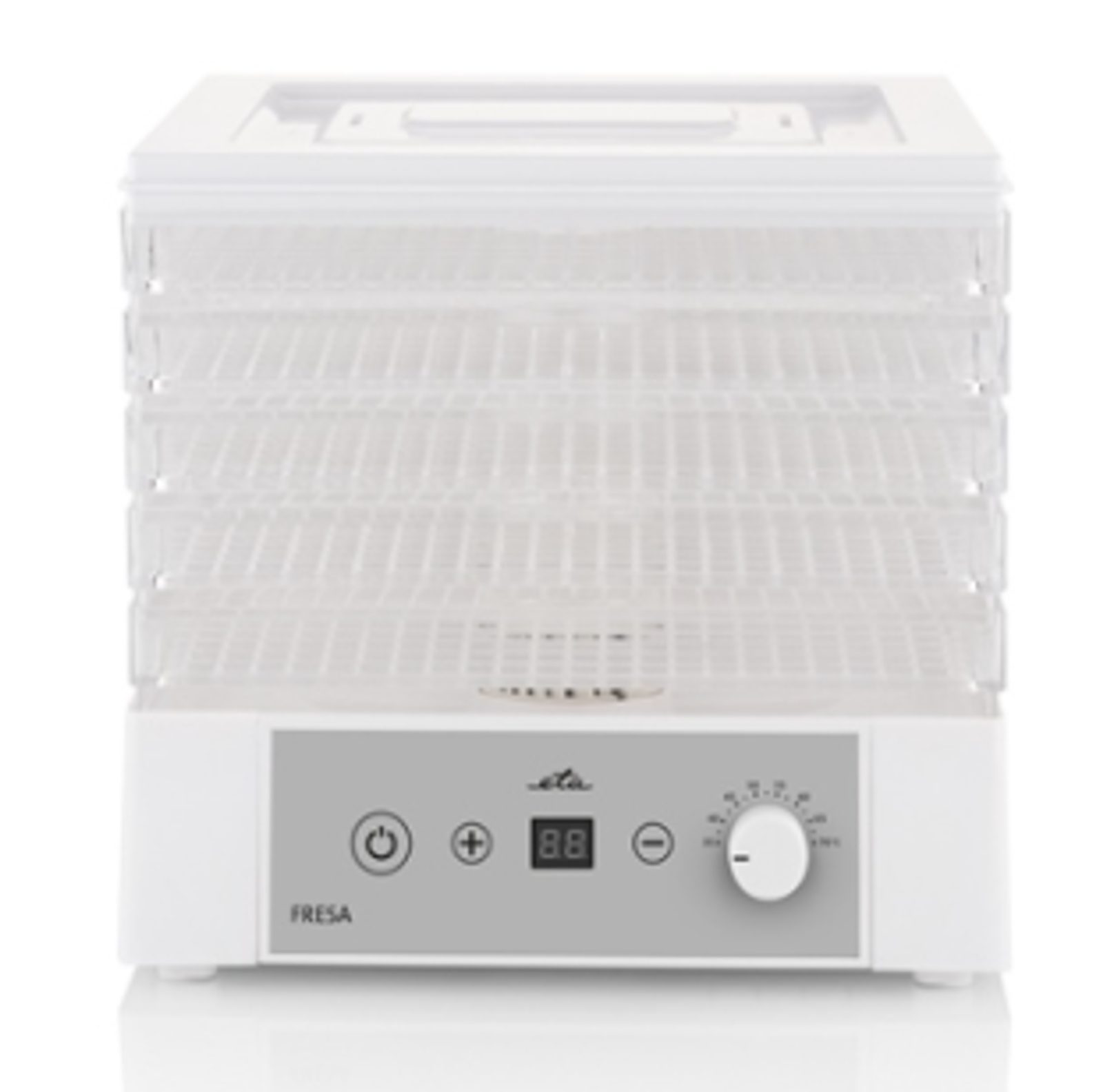 V sušičce potravin Eta FRESA můžete sušit ovoce, zeleninu, houby, ryby, maso (jerky) a bylinky. Součástí balení je 8 sušicích sít, na kterých lze zároveň sušit různé druhy potravin a můžete volit počet sušicích sít podle množství potravin. Balení obsahuje speciální síto na bylinky. Sušicí síta jsou čirá a tak usnadňují kontrolu procesu sušení. Teplotu sušení si nastavíte v rozsahu 35 - 70 °C.