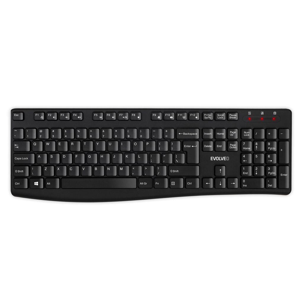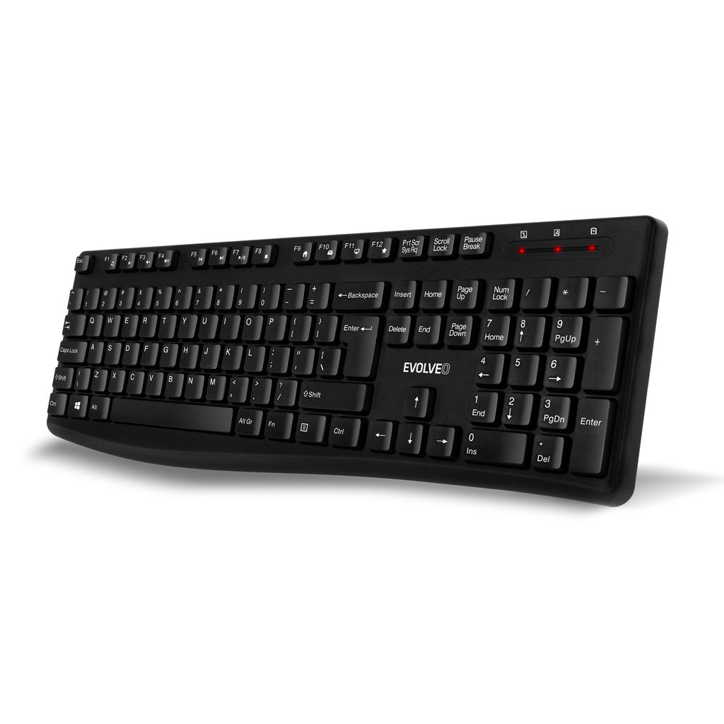 Klávesnice, která je součástí setu EVOLVEO K1050 obsahuje 105 klasicky rozložených nízkoprofilových kláves (s výškou 4,5 mm), díky nimž je fungování počítače plně ve vaší režii. Nechybí velká klávesa Enter, potisky s českými a slovenskými znaky ani trojice praktických LED indikátorů (NumLock, CapsLock a nízký stav baterie).