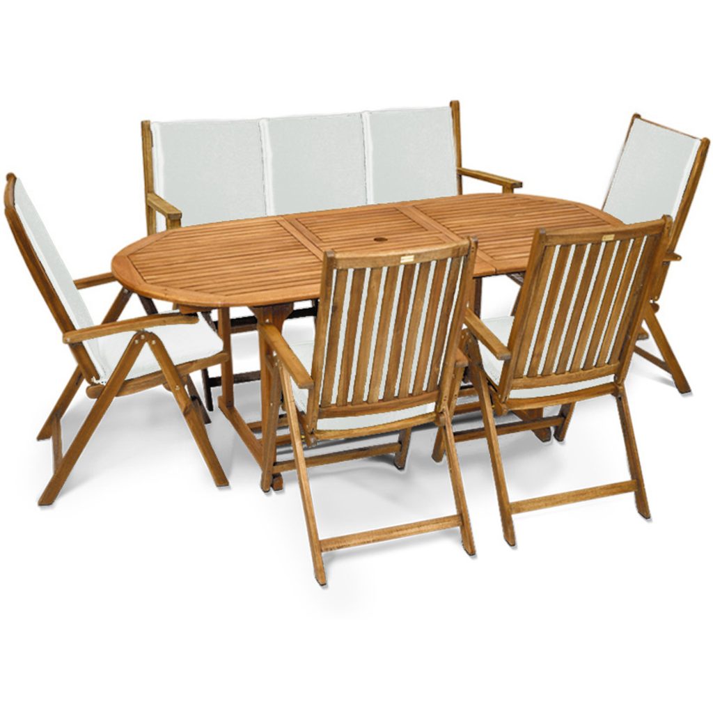 Základem sestavy jsou 4 křesla, třímístná lavice a rozkládací stůl
