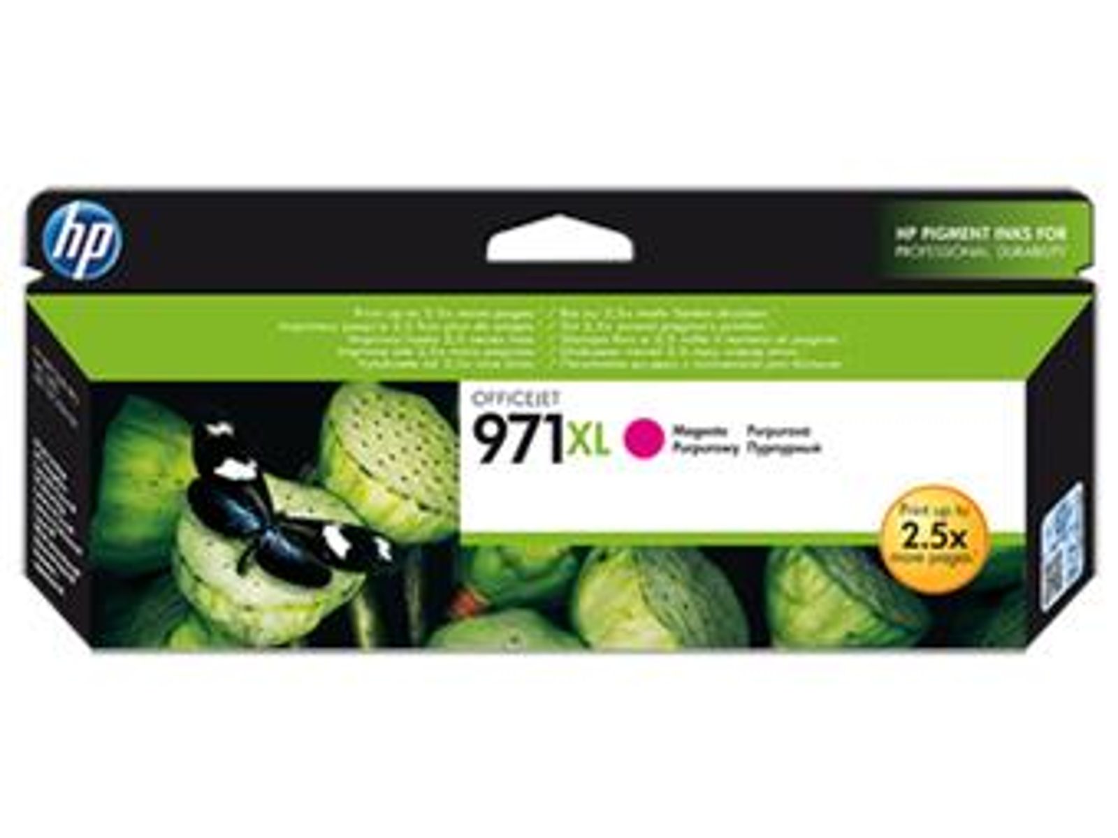 Purpurová inkoustová kazeta HP 971XL, výtěžnost 6600 stránek při 5% pokrytí. Kompatibilita s HP Officejet Pro X451/X551dw, Officejet Pro X476/X576dw.