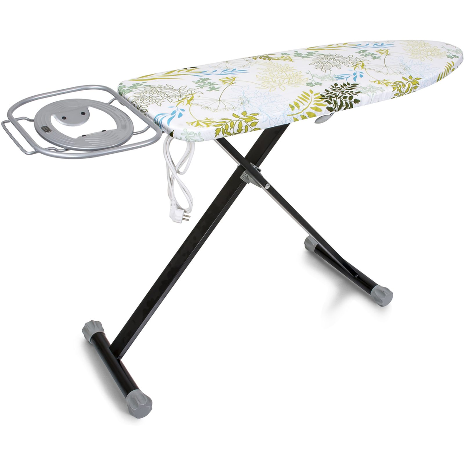 Kvalitní žehlící prkno opatřeno transportním zámkem, žehlící plochou odvádějící páru a elektrickou zásuvkou.
