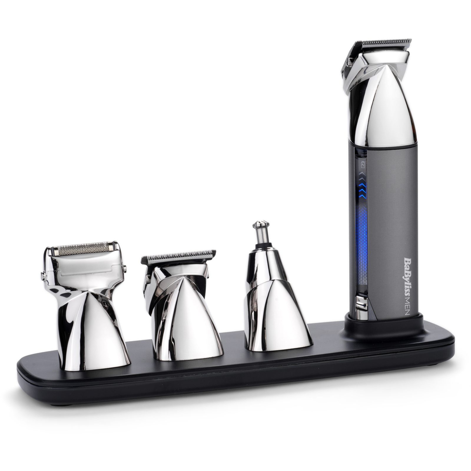Výkonný a vodotěsný multifunkční zastřihovač s dobíjecí základnou a indikátorem baterie. Obsahuje čtyři nástavce s magnetickým uchycením pro pohodlnou úpravu a střih vousů nebo chloupků.