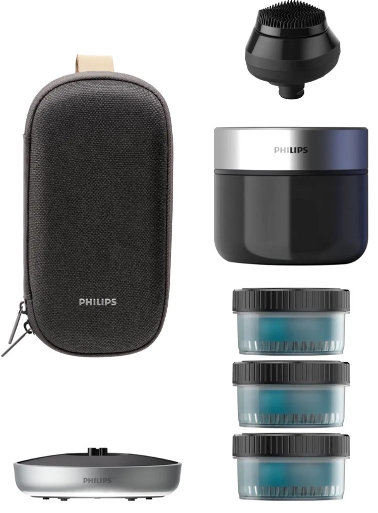 Nabíjecí stojánek, rychlá čisticí stanice, masážní nástavec Deep Clean 3 v 1 a cestovní pouzdro.
