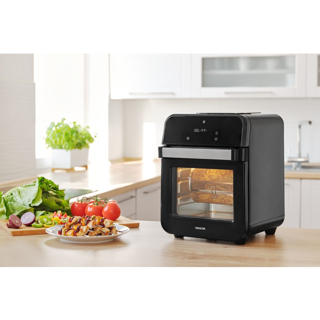 5 volitelných programů na přípravu pokrmů: Mražené hranolky / Doma připravené hranolky / Kuřecí stehýnka / Smažené kuře / Steak