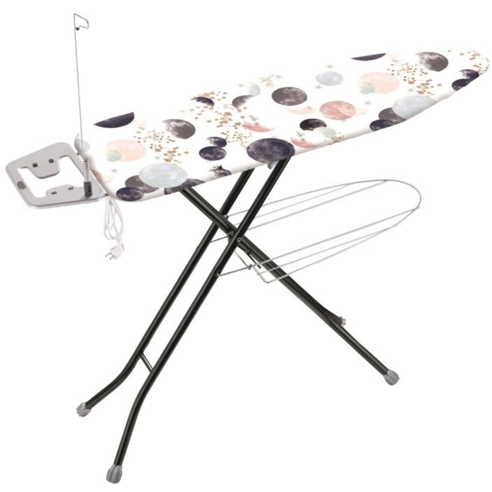 Kvalitní žehlící prkno opatřeno transportním zámkem, žehlící plochou odvádějící páru, elektrickou zásuvkou a držákem el. kabelu. Prkno má stabilní a bezpečnou konstrukci opatřenou protiskluzovými koncovkami u nohou výrobku. Součástí prkna je také bavlněný potah. Prkno je výškově nastavitelné do 92 cm s odkládací plochou pro napařovací žehličky se silikonovými prvky proti poškození plochy i žehličky při odložení a odkládací plochou pro prádlo.